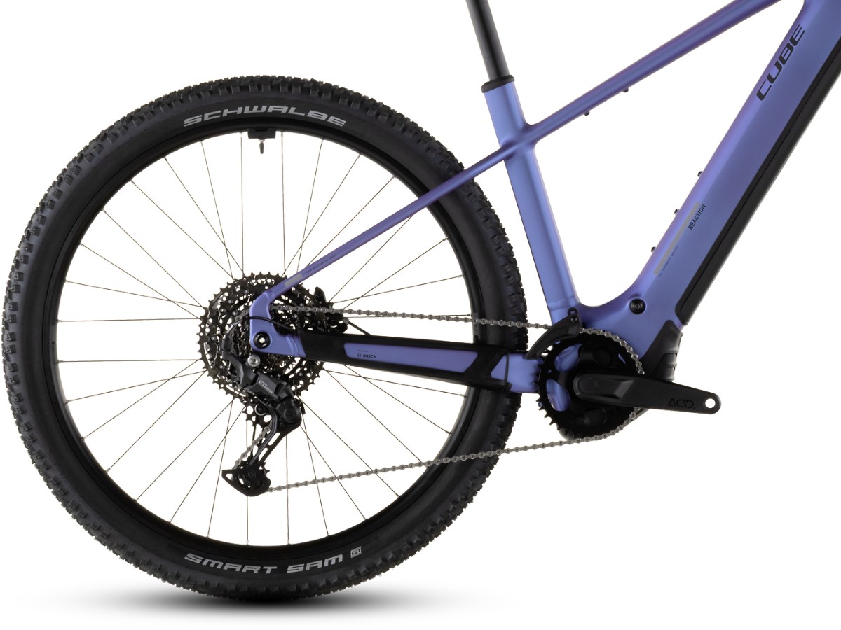 Die Eleganz und Qualität des Reaction Hybrid sind kein Zufall, denn der Rahmen kommt mit vielen cleveren Features daher. Sein 800 Wh starker PowerTube Akku von Bosch fügt sich gemeinsam mit dem Bosch CX Motor sicher, sauber und formschön ins Design ein. Zudem ist das Chassis PowerMore-ready, das heißt, es können bei Bedarf weitere 250 Wh mitfahren. Auch die integrierte Sattelklemmung und die nach innen verlegten Züge spielen der cleanen Linienführung in die Karten. Was noch? Eine Aufnahme für die Kettenführung und die Möglichkeit, ACID Schutzbleche, einen Gepäckträger und per X-Connect durch einfaches Aufstecken ein kompatibles ACID Vorderlicht nachzurüsten. Last, but not least haben wir dank unserem Size Split System für alle die richtige Passform im Angebot. Fazit: Alles da, was wichtig ist – für maximalen Fahrspaß!Egal wohin, egal wie lang – mit seinem geschmeidig arbeitenden Bosch Motor, 800 Wh starken Akku und cleveren CUBE Design rollt das Reaction Hybrid ONE dem Abenteuer entgegen! Dazu kommen zahlreiche clevere Features und ein eleganter Look. Aufsitzen, antreten – mit diesem E-Hardtail ist die Horizonterweiterung zum Greifen nah!Highlights