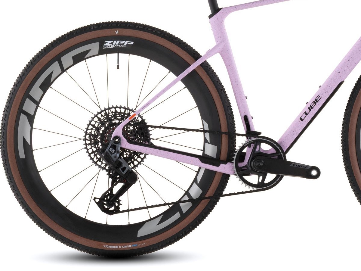 Das Nuroad C:62 SLX begeistert Gravel-Fans nicht nur mit seinem überaus detailverliebt konstruierten CUBE C:62® Carbonrahmen samt passender Gabel, sondern auch mit seinen Gravel-spezifischen Zipp 303 XPLR S Laufrädern mit hohen Felgen für den entscheidenden Vorteil in Sachen Aerodynamik und Speed beim Rennen. Auch die 45 mm G-One RX Pro Reifen von Schwalbe rollen pfeilschnell dahin – gebremst wird mit den hydraulischen Force AXS Scheibenbremsen von Sram. Ebenso aus dem Hause Sram stammt die robuste 12-fach GX Eagle Transmission, die absolut zuverlässig und sauber von Gang zu Gang schaltet. Übrigens: Am Sram Force Kurbelsatz ist ein Powermeter integriert – für den perfekten Überblick über die eigene Performance. Also nichts wie los, das Gravel-Abenteuer wartet schon!