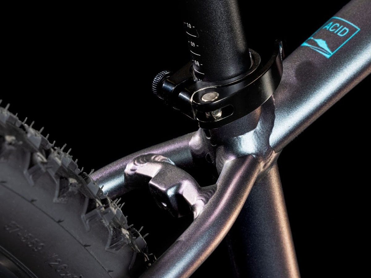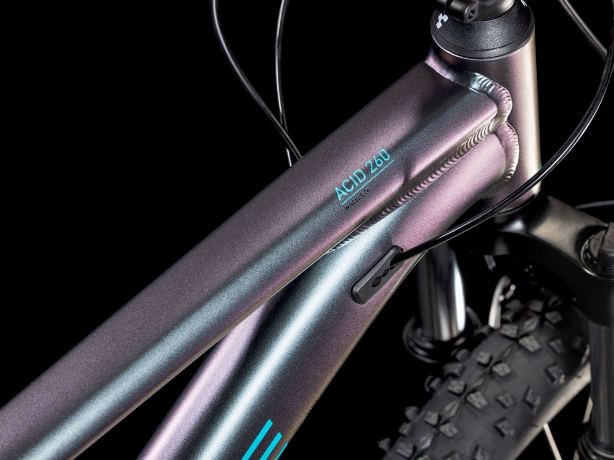 Keine halben Sachen – diesem Motto sind wir auch bei der Entwicklung unserer Junior-Bikes gefolgt. Kein Wunder also, dass beim Chassis des Acid 260 derselbe mechanisch geformte, doppelt konifizierte und hitzebehandelte 6061er-Aluminiumrohrsatz zum Einsatz kommt wie bei unseren Erwachsenenmodellen. In Kombination mit unserer Agile Ride Geometry entstand so ein Rahmen, mit dem Kids viel Selbstvertrauen tanken und ihre Skills effizient ausbauen können. Außerdem haben wir ein einfach austauschbares Schaltauge verbaut, damit ein kleiner Sturz nicht gleich das Ende der Welt beziehungsweise des Rahmens bedeutet.